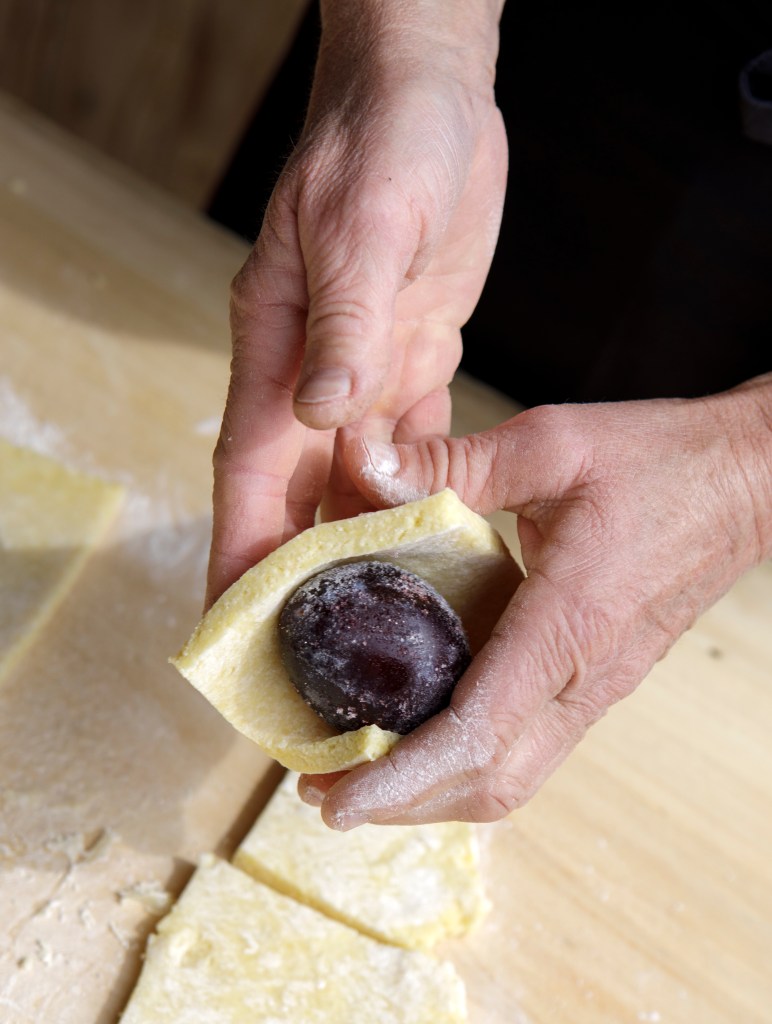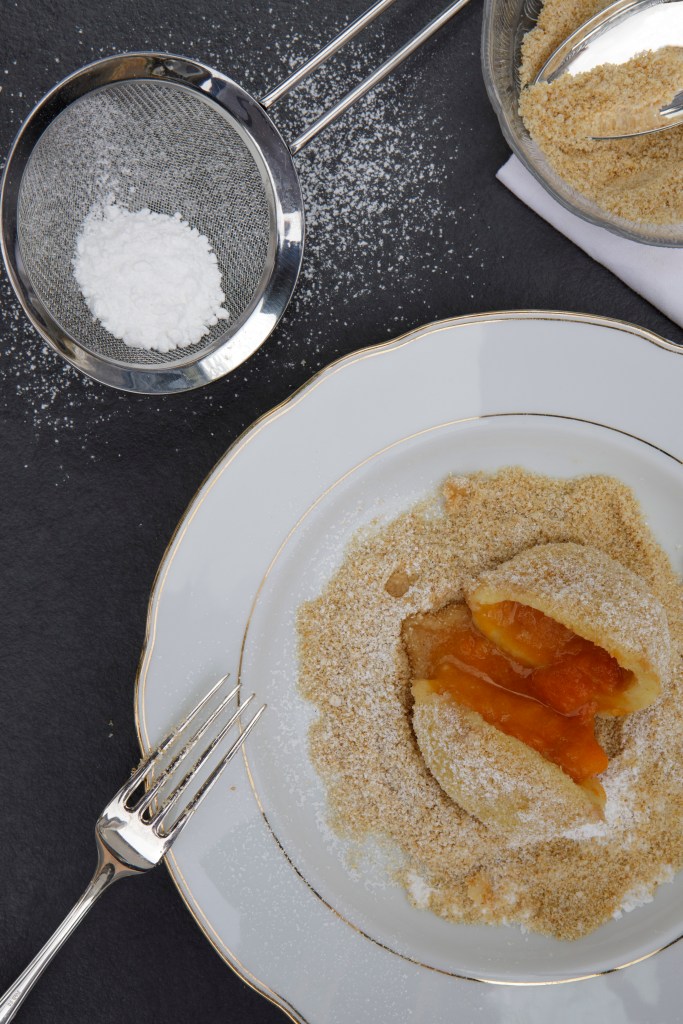 Erdäpfelteig zubereiten. Teig auswalken und der Zwetschke entsprechend große Rechtecke schneiden. Die Frucht mit dem Teig umschließen, zu einem Knödel formen und in Salzwasser ca. 15 Minuten wallen lassen. Derweil die Brösel gemeinsam mit dem Zucker und Zimt in Butter leicht anrösten. Die gekochten Knödel abtropfen und in den Bröseln wälzen.