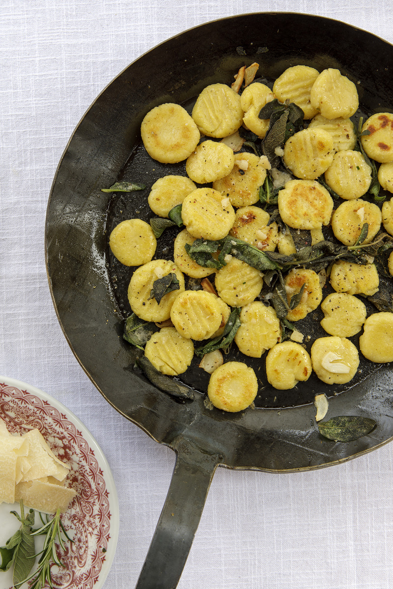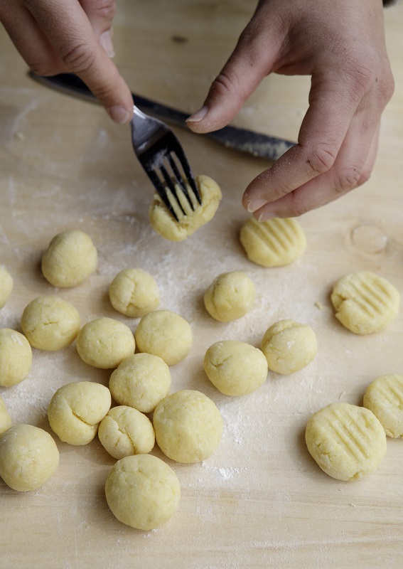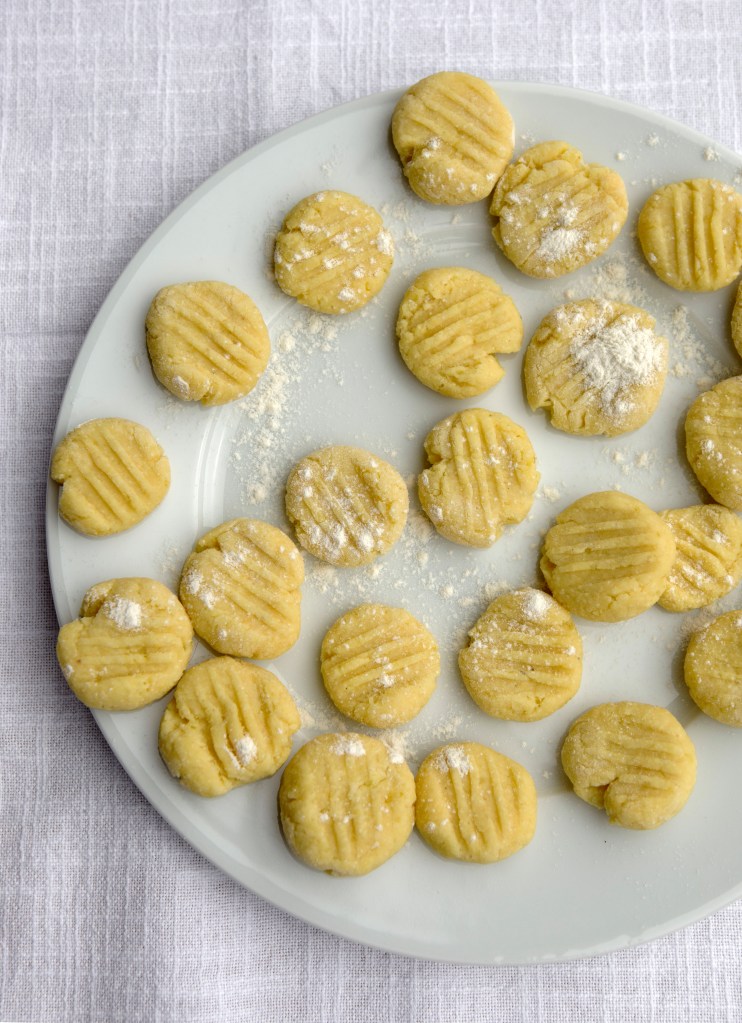 Erdäpfel kochen, kurz auskühlen lassen, schälen und pressen. Mit Mehl und Gries vermengen, Ei sowie Salz zugeben und zu einem Teig kneten. Aus dem Teig Rollen mit ca. 2 cm Durchmesser formen. In 4 cm lange Stücke schneiden und in einer Pfanne in heißem Öl rundum goldbraun ausbacken.